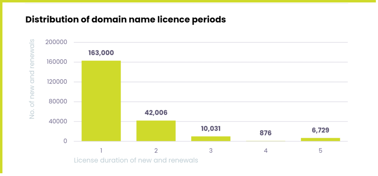 Across both new domain license registrations and domain renewals, the most popular domain licence period is by far a one year with 163,000 domains licensed. Two year licence periods are the second most common with 42,006 licenses, almost a quarter of the frequency of one year periods. Three and five year license periods are the third and fourth most popular (10,031 and 6,729), with four year periods being the least popular with 876.